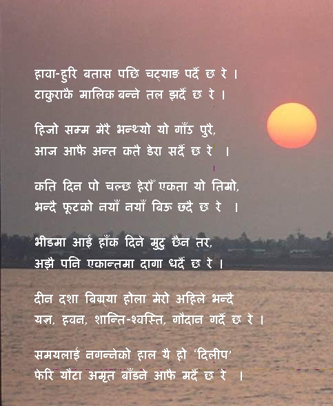 I could not wait to finish and post. मतियार सबै रद्दी रहेछ ! तिनी आफै बाङ्गो लठ्ठी रहेछ ! तमासा हेर्न सडकमा पर्खें बिना सवारका बग्गी रहेछ ! मातेरै निस्के लुकि छिर्ने पनि दरबार भन्नु भट्टी रहेछ ! झोलमा डुब्दा बल्ल थाहा पाए चोक्टा जति सारो हड्डी रहेछ !