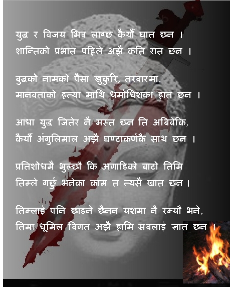 खतरा छ दिलिप दाई! एक से एक शेर छन्, सबभन्दा मन परेको चाहिँ; युद्ध र विजय भित्र लाग्छ कैयौं घात छन । शान्तिको प्रभात पहिले अझै कति रात छन। र आधा युद्ध जितेर नै मस्त छन ति अविवेकी कैयौं अंगुलिमाल अझै घण्टाकर्णकै साथ छन् ।
