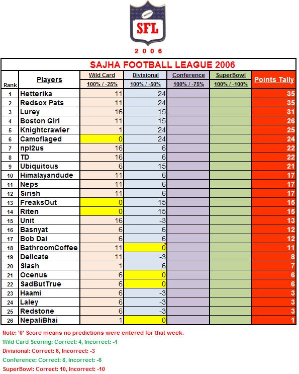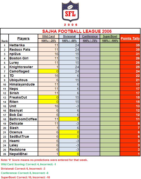 knight crawler bro i think you got my score wrong...i should have 16 points for the wild card prediction ...if you can correct it out for me please ...:) goodluck with next weeks predictions