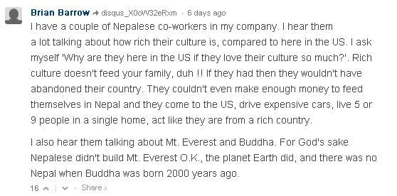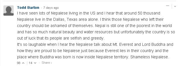 I agree this guy could be a Nepali. BUT the comment has got 95 THUMBs UPs. The Highest number of Thumbs ups among all. Are you saying that those who gave him Thumbs Ups are all Nepalese ? No Way. They must be mostly Americans, right ?
