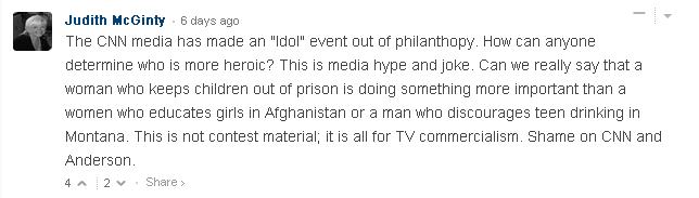And I totally agree with this comment by Judith. The only reason I didn't vote for her/or anyone was because that would have been unfair for other good souls out there in line. They all deserve the same respect/help as whoever was winner. They're great philanthropists in their own field. Why only 1 person out of those all good samaritans? There should not be any comparison on how good hearted you are to others.
