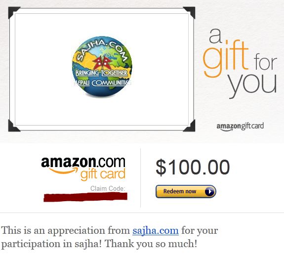 Thank you for all the votes. We certainly didn't deserve it, but we figured we could use the prize money for something that could help other people. We emailed San today and asked him to donate the prize money to HelpNepal, the largest charitable network of Nepalis, on behalf of sajha.com. We all can take pride in this contribution since we all contributed to it one way or the other. Although it isn't that big of an amount, we hope it will help someone someday.