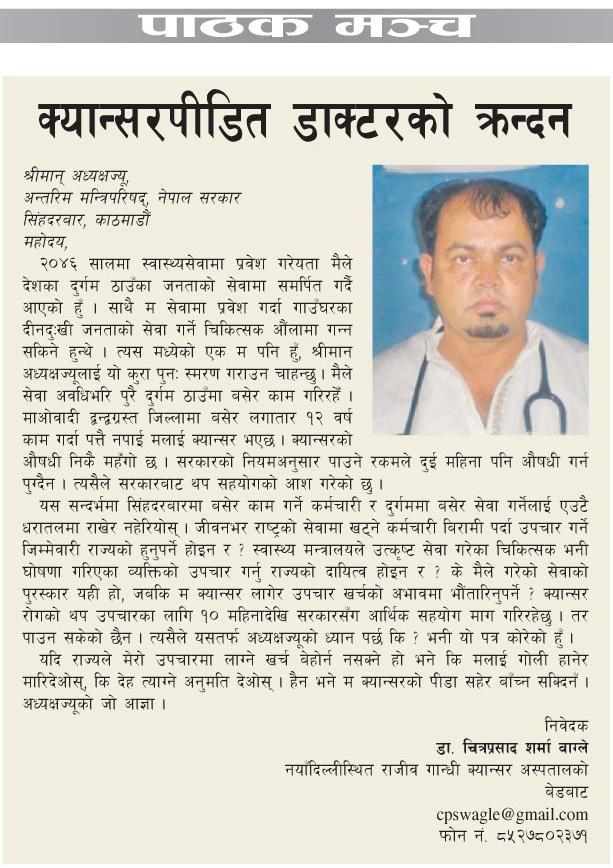 डा. चित्रप्रसाद शर्मा वाग्लेको विषयमा केहि महिना अघि एक राष्ट्रिय दैनिकमा समचार आएको थियो । आज पुन कान्तिपुर दैनिकको पाठक मञ्च स्तम्भमा नेपाल सरकारलाई सहयोगको लागि नयाँ दिल्ली स्थित राजीव गान्धी क्यान्सर अस्पतालको बेडबाट लेखिएको उनको निवेदन माथि आखाँ पुग्यो । अझैपनि सरकारबाट उनले उचित सहयोग पाउन नसकेको सुन्दा धेरै दुख लाग्यो ।
