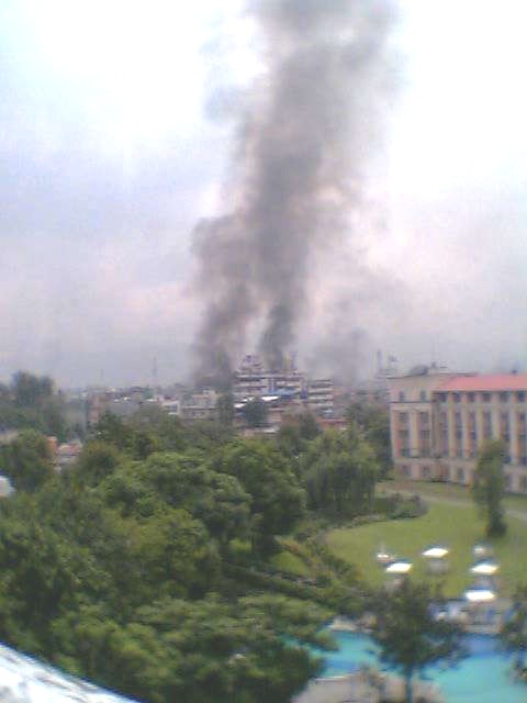It has been a surreal morning in Kathmandu. It seems like we've had our own version of 9/11. From atop the roof of a prominent building in central Kathmandu, the city resembled a burning oilfield as thick plumes of smoke arose from numerous corners of the city. Jame Masjid in Ratna Park was vandalized as armed policemen watched on, petrified and unsure about what to do. Rumours have it that numerous "manpower" agencies in Kathmandu have been destroyed. I personally saw and heard glass panes of the Gulf Air office in Hattisar being smashed, its computers and office furniture dragged outside and set on fire. Numerous shells of tear gas have been fired at different locations in the valley to disperse the mob. There are also rumours that the fugitive Chiranjibi Wagle's house has been destroyed. Amidst all this chaos, the district administration office has finally declared a curfew beginning 2 pm. It seems that the tire-burning and rampant vandalism as come to a halt as people can be seen scurrying about trying to make it to their homes. Oh wait a minute, even as I write this, a colleague who is still on the roof monitoring the situation reports that a few rounds have been fired. By whom? At whom? It is not clear. I'm including a few quick shots from my Nokia. 1:27 pm. Kathmandu.