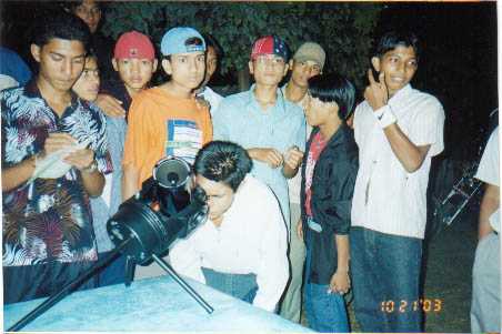I took these photos and the person holding the child might be the school teacher where we conducted moon observation. We encouraged the children not touch the eye piece, cuz if the telescope moves, then you may loose the field of sight, ie lose the celestial object being targetted..... This is the science of Telescopes.... And you ... green horns, when will you grow to understand these issues ?????? Bigyan ko shikhar ma pugeko muluk ma basera esto prashna sodhna Laaaz Lagdaina ?? My advice to you all..... stop runnig after fulush (ie money in arabic) 24 hours a day and join a local astro club there instead ..... or just buy a six inch Dobsonian lightbucket and organise observation yourself......(Consult TestDirector for details)...... Show to Amricans that Nepalese are gentlemen, show them that Nepricans just dont get lost in day to day earthly problems, but also have a vision to reach the stars.... And when this happens, I will be most proud of you. My sons! Hulaki Uncle.