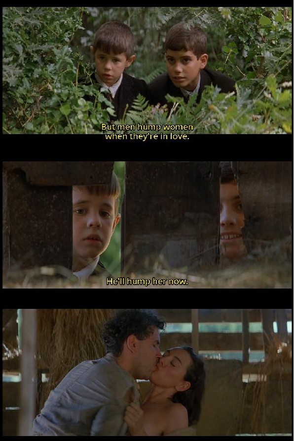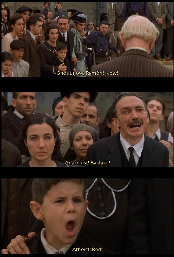 In my view, this the finest moment of the movie. Mark the strange words Moncho uses to denounce his teacher. These two words that come from two symbolic moments during the movie transcends politics, penetrate psychology and touch the soul of the boy and perhaps of us.