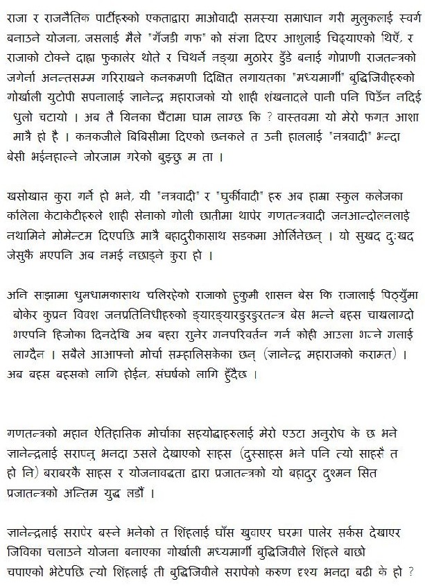 >ज्ञानेन्द्रलाई सरापेर बस्ने भनेको त शिंहलाई घाँस खुवाएर घरमा पालेर सर्कस देखाएर जिविका चलाउने योजना बनाएका गोर्खाली मध्यमार्गी बुद्धिजिवीले शिंहले बाछो चपाएको भेटेपछि त्यो शिंहलाई ती बुद्धिजिवीले सरापेको करुण दृश्य भनदा बढी के हो ? Sounds great! The 1st jhataro!! To be positive, The yesterday's movement by the King has opened a chance for dialogues with Maoists, as they have had reiterated direct talks with the king. (Aru pachhi hai office ma khusukhusu lekhya... ... ...)