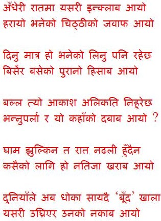 Swati, Talking about Krantikari poets, I remember this famous sher from Faiz Ahmed Faiz- Krantikari poet of Urdu Lao to katalnama mera me bhee dekh lun kis kis ki muhar hai sar-e-mahzar lagee hui लाओ तो कतलनामा मेरा में भी देख लुँ किस किस कि मुहर है सर-ए-महजर लगी हुई Let me see my execution order. I want to see whose signatures are on it. At the end of the day, may be not at the end of the day, but in next bright morning, when a tyrant becomes just an individual- abandoned by all, what the world will not abandon is to remember the list of people who approved the tyranny. म पनि हेरुँ मेरो मृत्युको फैसला-नामा कस कसले हालेछन् सहिछाप साझामा