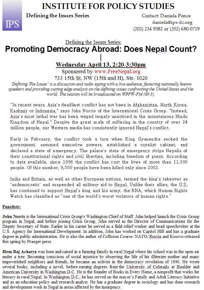 Chip and other interested readers, The transcript of 25th March Panel Discussion participated by Murari Raj Sharma, T. Kumar, Chitra Tiwari and Shusil Pyakurel is available here. - http://www.freenepal.org:8080/FreeNepal/action/content.do?path=NEWS (By the way did you listened to Shusil Pyakurel yesterday in BBC ? That and Kunsang Kaka's recent commentary about Nayan Bahadur Khatri, put together, makes one deduce that Khatri Bandhu has been hijacked by Gyanendra Maharaj. Khatri bandhu le ra NHRC le ahile samma kamaayeko pratishtaa ra vishasniyata Gyanendra Maharaj le kwaplwakkai khaisya ho ta ? )