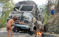 yes, thank you for posting these! i couldn't find the other photo on nepalnews either....the full moon photo is a beautiful picture, but seems so out of place here. the first one is so gentle and tender. the one of the small kids looking at the burning truck is amazing! i'm surprised this is the first time i've seen this photo- it has the potential to become a legendary image of nepal's war. similar to the way that one photo of the young, naked vietnamese girl running and screaming down the street has become an icon of the vietnam war. as for the last photo, it's absolutely heartbreaking.