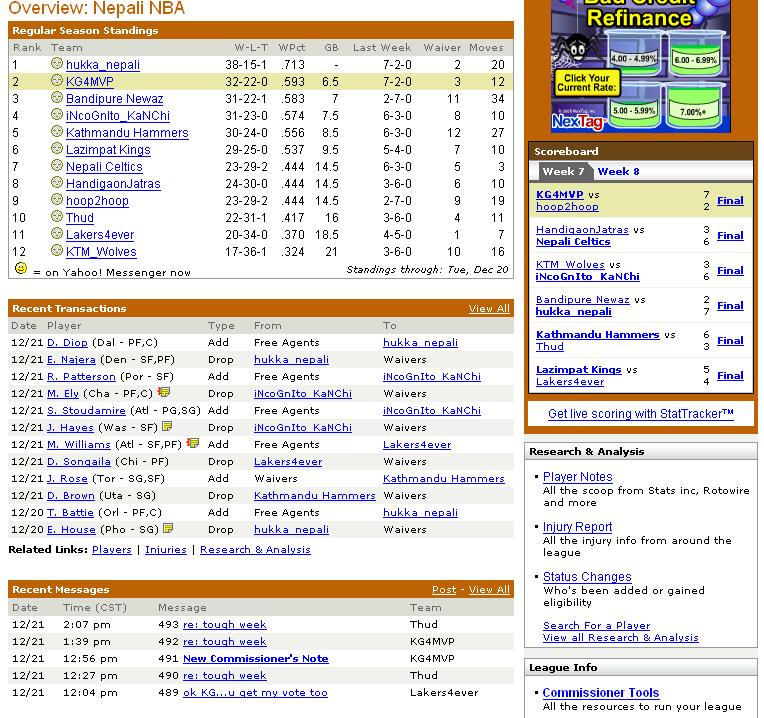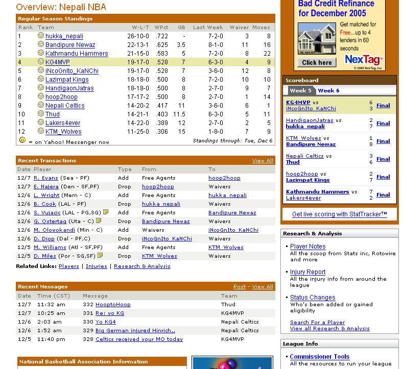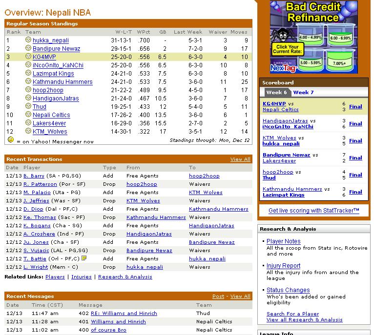 KG4MVP, here's the scary thing my team is not in full strength. Ak47 is coming off the bench and Boozer is not playing at all. If i were to play week last week, I would have won 5-3-1 :D:D I am looking forward to next week matchup against hukka_nepali. So far hukka has injury free roster and i hope it will remain the same till next week ;) we will know who has the best team next week :D:D didn't mean to offend other teams :=) DWI keep up the good work. ya did very well.... one suggestion to ya, don't try to change the players too much, I believe you only get 64(???) moves. Correct me if i am wrong commish.... I know i needa do the same :=) celts bru you a NONFACTOR??? now i know ya are a football guy :p:p KG4MVP, i think admin did it purposely..... joke garya feri... w/o sajha this league won't be possible so i encourage my fellow mgrs (can we call ourselves???) to contribute money to sajha