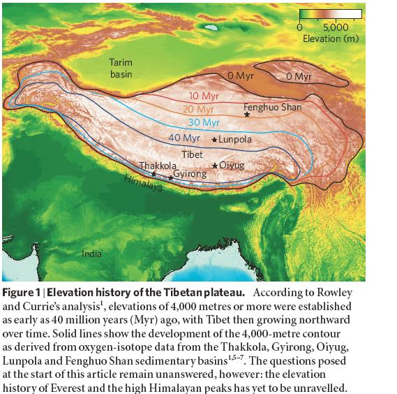 The rise and growth of Tibet Andreas Mulch and C. Page Chamberlain It is not difficult to be impressed by the grandeur of high mountainous regions, but it is difficult to reconstruct how the elevation of such regions evolved. A study of the Tibetan plateau does just that. Is Everest now at its highest point, or was it once even loftier? What was the greatest height attained by the vast highlands of the Tibetan plateau, and when did this occur? As described elsewhere in this issue by Rowley and Currie (page 677)1, these questions can be tackled — if not yet answered definitively — by analysing the isotopic composition of ancient raindrops. With this approach, the authors show that Tibet continuously grew northward over millions of years in response to the thickening of Earth’s crust associated with the collision of the Indian and Asian continental plates. The driving forces for this collision are generated deep in Earth’s mantle. But the key to unravelling the uplifting history of the central Tibetan plateau is found in lake sediments on the plateau, some of which formed as long ago as 40 million years. In these lakes and their surrounds, changes in the oxygenisotope composition of surface water (which is controlled by regional climate and elevation) are recorded in sediments. Systematic variations in oxygen-isotope composition across the plateau reveal that spatially variable uplift of the plateau to 4,000 metres or more above sea level was intimately linked to the timing and rates of convergence of India and Asia (Fig. 1). Rowley and Currie1 estimate that uplift to 4,000 metres was initiated as long ago as 40 million to 50 million years, in the early stages of that convergence. The evolution of mountain topography reflects the balance between tectonic forces in Earth’s crust and upper mantle, and climatically driven erosion at Earth’s surface. Their relative role in controlling the rise of mountains remains unclear2,3, but the problem can be approached by reconstructing the elevation history of large continental plateaux. Such studies can improve our understanding of the coupling between tectonics and long-term climate change. For example, the Tibetan plateau — the largest continental highland on Earth — is a major barrier to air flow in the atmosphere, and it has been suggested that uplift of the plateau triggered the onset of the Indian summer monsoon3. The chemical fingerprint of rain and snow that precipitated on the Tibetan plateau is found in the oxygen-isotope composition of calcareous minerals in Tibetan lake sediments. This is expressed as _18O, which is the 18O/16O ratio in the soils or sediments relative to the 18O/16O ratio in sea water. For example, the _18O of calcite formed in soils is related to the_18O of soilwater or groundwater by a temperature- dependent fractionation factor; so _18O in calcite formed in soil is a sensitive tracer of surface water that stems from precipitation. The underlying principle of oxygen-isotope altimetry is that water that precipitates as rain or snow becomes increasingly depleted in 18O the higher up a mountain range that it falls4; systematic changes in _18O with elevation can then be used to infer relative elevation differences between the water source in the ocean and the elevation at which the rain or snow fell5,6. In the context of earlier isotopic studies6,7, the low _18O values of carbonates found by Rowley and Currie1 across the central Tibetan plateau reflect the south–north migration of high terrain in response to crustal thickening and the buoyant rise of Earth’s surface. This finding agrees with the results of thermomechanical modelling for the growth and uplift history of the Tibetan plateau8. It was proposed previously that the present stature of Tibet reflects tectonic processes involving thinning and delamination of Earth’s crust and mantle during the Miocene (10 million to 8 million years ago)3. But it has since been suggested9,10 that the sequential rise and northward growth of Tibet started much earlier than that, in Eocene times, about 50 million years ago. The new results1 support this idea that the Tibetan plateau is a long-standing topographic feature that arose from the collision between India and Asia, and is not the more recent product of other, deeper-seated processes. The results also show that stable isotopic data from sedimentary sequences do indeed record the long-term, high-elevation history of the plateau, and can provide absolute elevation constraints at various times in the geological history of such a topographic feature. Moreover, taken in conjunction with independent estimates of palaeoelevation11, this approach overcomes some of the limitations in deciphering the competing effects of climate and elevation change in the past. Only slowly are we making progress in understanding how the interactions of surface uplift, bedrock erosion and sediment transport create dynamic feedbacks between the biosphere, the atmosphere and the crust and upper mantle. However, new techniques for estimating palaeoaltimetry that relate processes at various levels of Earth’s crust, from the surface to deeper regions where high-temperature deformation causes rock flow, will allow us to develop a more dynamic view of how mountain ranges change their shape and stature. Such techniques exploit elevation- dependent changes in concentration of carbon dioxide in the atmosphere12, or the isotopic composition of surface waters that circulate deep in Earth’s interior during the late tectonic evolution of mountain ranges13. Deciphering the oxygen-isotope record in lake and soil deposits requires careful consideration of the competing effects of climate change and changes in surface elevation. The application of multi-proxy isotopic systems, which take account of both surface and deeper Earth environments, can complement such studies and greatly enhance our predictive capabilities in such a task. ■Andreas Mulch