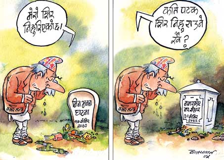 The Man: Regression He says: My head bows The Poll: Minbhivan Incident, 17 Mangshir 2062 Next frame: How many times do I have to bow my head? Nagarkot Massacre, 30 Mangshir 2062 Cartoon by Batshyan via Kantipur