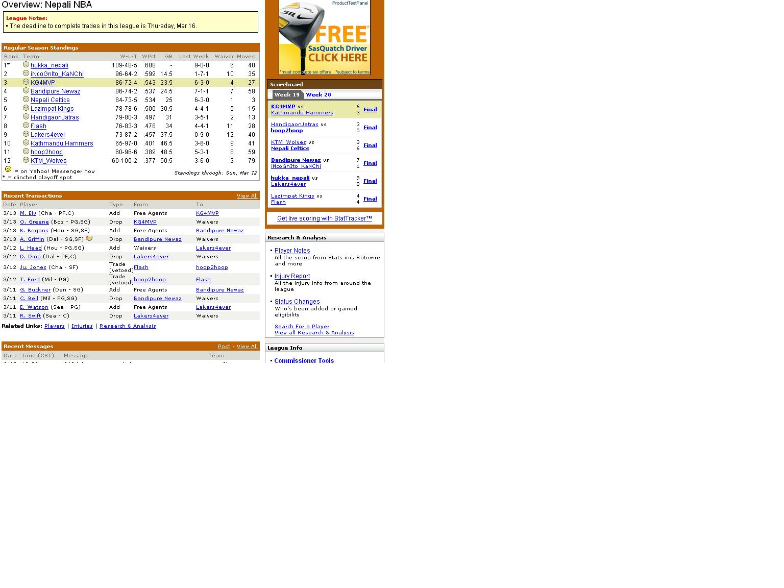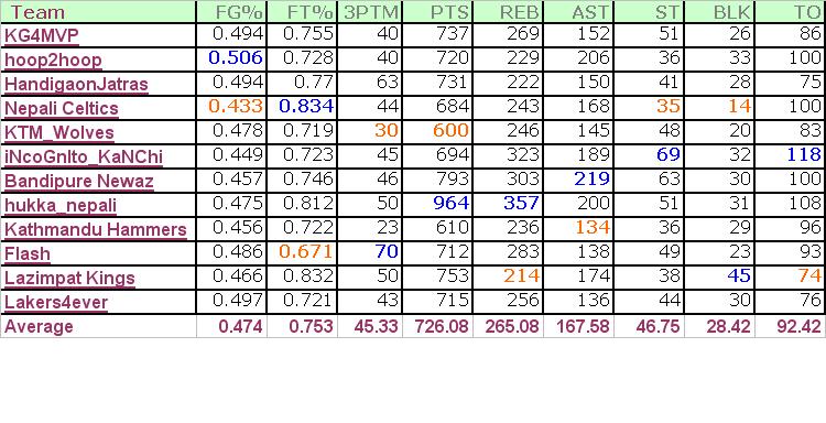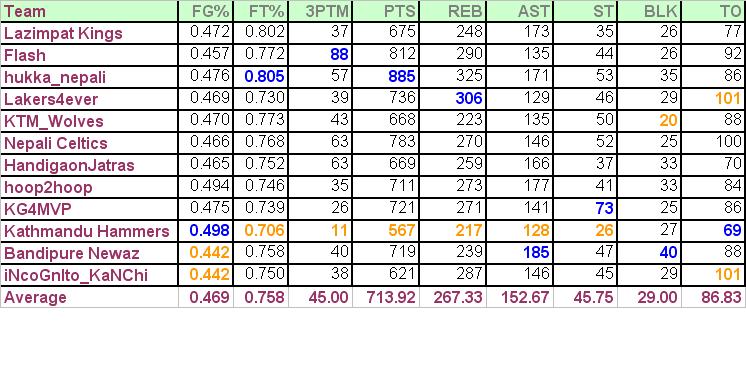 954 pts for Hukka and 70 3-pointers for Flash!!!! that would have to be Nepali fantasy records in those categories. I would have beat the "average" by 6-3 but would have lost to the "Big three" (Hukka, Kanchi and Ax). BTW AX, tyo march madness ko password chahi k ho ni?