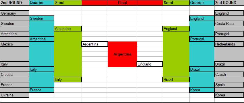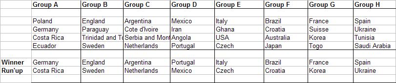 Here is my guess for the first round outcomes: Group A Jun 9 12:00 ET Germany 2-1 Costa Rica Match 1 Munich Jun 9 15:00 ET Poland 1-0 Ecuador Match 2 Gelsenkirchen Jun 14 15:00 ET Germany 1-0 Poland Match 17 Dortmund Jun 15 09:00 ET Ecuador 0-1 Costa Rica Match 18 Hamburg Jun 20 10:00 ET Costa Rica 1-1 Poland Match 34 Hanover Jun 20 10:00 ET Ecuador 0-1 Germany Match 33 Berlin Group B Jun 10 10:00 ET England 1-1 Paraguay Match 3 Frankfurt Jun 10 12:00 ET Trinidad & Tobago 0-2 Sweden Match 4 Dortmund Jun 15 12:00 ET England 2-0 Trinidad & Tobago Match 19 Nuremburg Jun 15 15:00 ET Sweden 1-1 Paraguay Match 20 Berlin Jun 20 15:00 ET Paraguay 2-0 Trinidad & Tobago Match 36 Kaiserslautern Jun 20 15:00 ET Sweden 0-0 England Match 35 Cologne Group C Jun 10 15:00 ET Argentina 2-0 Ivory Coast Match 5 Hamburg Jun 11 09:00 ET Serbia & Montenegro 0-1 Netherlands Match 6 Leipzig Jun 16 09:00 ET Argentina 2-0 Serbia & Montenegro Match 21 Gelsenkirchen Jun 16 12:00 ET Netherlands 1-0 Ivory Coast Match 22 Stuttgart Jun 21 15:00 ET Ivory Coast 0-0 Serbia & Montenegro Match 38 Munich Jun 21 15:00 ET Netherlands 0-0 Argentina Match 37 Frankfurt Group D Jun 11 12:00 ET Mexico 1-1 Iran Match 7 Nuremburg Jun 11 15:00 ET Angola 0-2 Portugal Match 8 Cologne Jun 16 15:00 ET Mexico 1-0 Angola Match 23 Hanover Jun 17 09:00 ET Portugal 2-0 Iran Match 24 Frankfurt Jun 21 10:00 ET Iran 1-0 Angola Match 40 Leipzig Jun 21 10:00 ET Portugal 1-0 Mexico Match 39 Gelsenkirchen Group E Jun 12 12:00 ET United States 0-2 Czech Republic Match 10 Gelsenkirchen Jun 12 15:00 ET Italy 1-0 Ghana Match 9 Hanover Jun 17 12:00 ET Ghana 0-1 Czech Republic Match 26 Cologne Jun 17 15:00 ET Italy 2-0 United States Match 25 Kaiserslautern Jun 22 10:00 ET Czech Republic 1-1 Italy Match 41 Hamburg Jun 22 10:00 ET Ghana 0-0 United States Match 42 Nuremburg Group F Jun 12 09:00 ET Australia 1-1 Japan Match 12 Kaiserslautern Jun 13 15:00 ET Brazil 2-1 Croatia Match 11 Berlin Jun 18 09:00 ET Japan 1-2 Croatia Match 28 Nuremburg Jun 18 12:00 ET Brazil 3-1 Australia Match 27 Munich Jun 22 15:00 ET Croatia 2-1 Australia Match 44 Stuttgart Jun 22 15:00 ET Japan 0-3 Brazil Match 43 Dortmund Group G Jun 13 09:00 ET South Korea 1-0 Togo Match 14 Frankfurt Jun 13 12:00 ET France 1-1 Switzerland Match 13 Stuttgart Jun 18 15:00 ET France 2-0 South Korea Match 29 Leipzig Jun 19 09:00 ET Togo 1-2 Switzerland Match 30 Dortmund Jun 23 15:00 ET Switzerland 2-0 South Korea Match 46 Hanover Jun 23 15:00 ET Togo 0-2 France Match 45 Cologne Group H Jun 14 09:00 ET Spain 2-1 Ukraine Match 15 Leipzig Jun 14 12:00 ET Tunisia 1-1 Saudi Arabia Match 16 Munich Jun 19 12:00 ET Saudi Arabia 1-2 Ukraine Match 32 Hamburg Jun 19 15:00 ET Spain 2-0 Tunisia Match 31 Stuttgart Jun 23 10:00 ET Saudi Arabia 0-2 Spain Match 47 Kaiserslautern Jun 23 10:00 ET Ukraine 1-1 Tunisia Match 48 Berlin