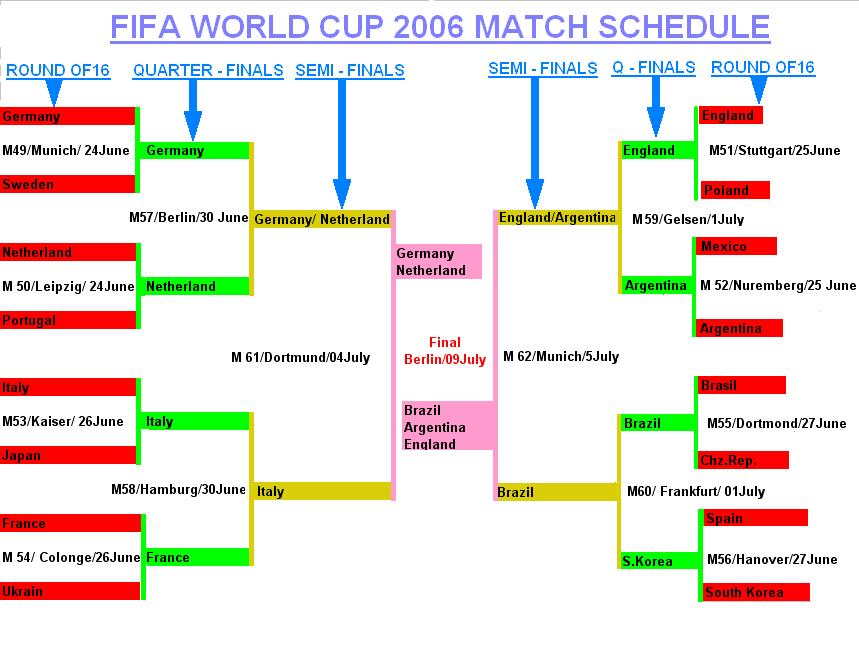 यस वर्ष हुनलागेको विश्वकप २००६ मा ३२ राष्ट्रहरु छनौटमा परेका छन्। ति सबै राष्ट्रहरुलाई विभिन्न ८ समूहमा विभाजन गरिएको छ,र प्रत्येक समूहमा ४ राष्ट्रहरु छन्। प्रथम चरणका खेलहरु लिगको आधारमा खेलाइने छ र अंकको आधारमा २ सर्वोकृष्ट राष्ट्रहरु दोश्रो चरण(Round of16) मा प्रवेश गर्ने छन् भने वाँकि २ राष्ट्रहरु विश्वकपबाट वाहिरिनेछन्। प्रथम चरणका खेलाइने खेलहरुको मिति,स्थान तथा राष्ट्रहरुको नामावली आयोजकहरुले प्रकाशित गरिसकेका छन्। दोश्रो चरण(Round of 16) अनि त्यस पछिका म्याचहरु(quarter finals,semi finals and finals) को मिति र स्थानको मात्र घोषणा भएको छ तर राष्ट्रहरुको नाम हामीलाई थाहा छैन। कुन समूहबाट कुन राष्ट्रबाट वाहिरिने हो र कुन अर्को चरणमा पुग्ने हो,यसको अनुमान गर्न निकै कठिन छ। मैले विश्वकपमा सहभागी प्राय सबै प्रमुख राष्ट्रहरुको खेलहरु विगत ४ वर्ष देखि नियमित रुपमा केहि प्रत्यक्ष र वाँकि टेलिभिजनमा हेर्दै आएको छू.मैले हेरेका खेलहरु(Euro cup qualifying 2004,Euro cup Portugal 2004,FIFA Confederations Cup Germany 2005,fifa world cup qualifying2006 and friendly matches)को आधारमा, यस प्रतियोगितामा सहभागी टिमहरुको खेलको स्तर,खेलाडिहरुको क्षमता र टिमहरुको रणनितिको आधारमा मैले अनुमानित म्याचहरुको तालिका तयार पारेको छु जुन यसप्ररकारको छ.यसमा स्थान, मिति र राष्ट्रहरुको नाम सवै उल्लेख छ.