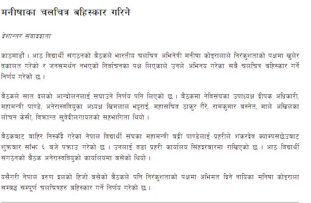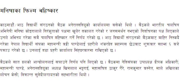 Manisha KOirala ko boycott nagarum sathi haru..... it was the same manisha koirala who urged to vote for her father Prakash Koirala in the last election and said that she would go on a picninc with them people of Prakash Koirala won and the people voted for Prakash Koirala and he won.................... it was the strong territory of CPN UML .....hahaha that is the state of the voters and democracy in NEpal...where people vote becuase an actress promises to go to picnic....... so i dont understand this dog barking for that kinda democracy in our country......ooo sorry my country Nepal........ ya sajha basi haru ta saap NEPRICA ko NEprican haru ho .....bhulechu po