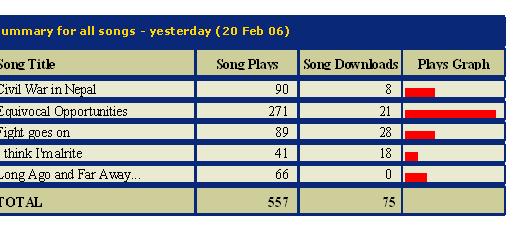 A big THANKS to you all who cared to visit the site and listen to the songs. For you refrence, I copy and paste the statistics from yesterday (see the figure below). That was very encouraging.