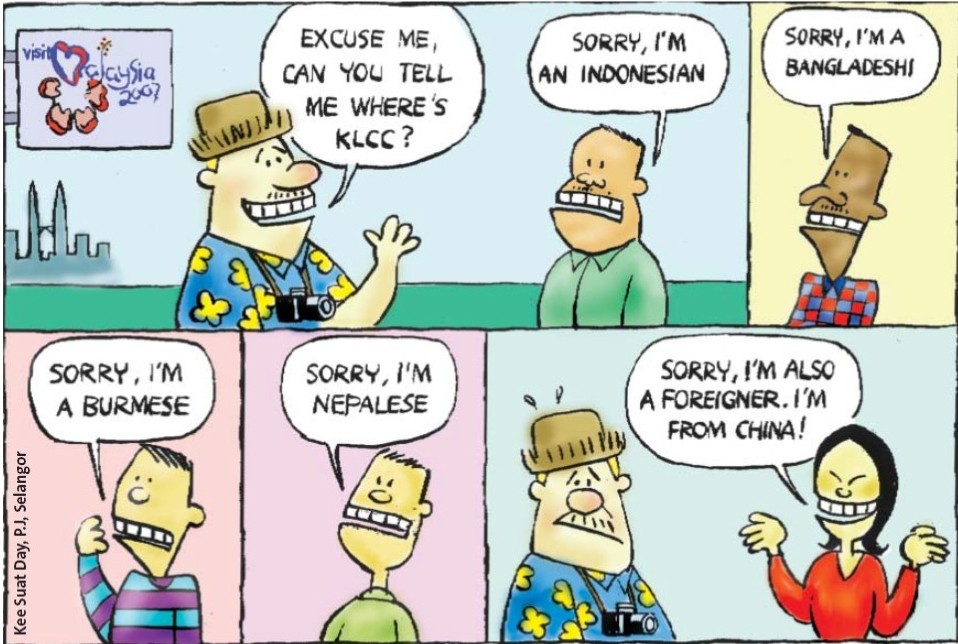 I think this is a cartoon that appeared in a Malaysian journal. KLCC stands for Kuala Lumpur City Center. Must be something satirical about the foreign worker's influx in their country. My guess ! I Nepali should explain it.
