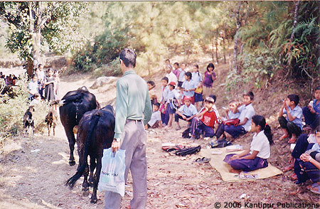 Students and teacher conducting classes inside a nearby jungle in Parvat district after Maoist padlocked the Tulodaya lower secondary school at Tilhar VDC.