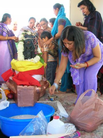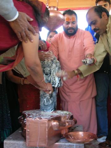 Maharajji performing Maha Abhishek of Shri Pashupatinath Shivling. The shivling was brought to Houston from Bhaktapur, Nepal.