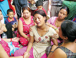 माओवादी आक्रमणमा मंगलबार मृत्यु भएका धरान वडा कार्यालयका प्रहरी हेम श्रेष्ठकी शोकाकुुल पत्नी सीमालाई सान्त्वना दिंदै आफन्त ।