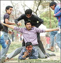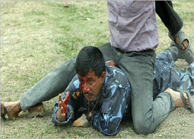 Nepal Police and army have never maintained friendly relationship with the public. They are paid by hard earned tax of common people but they always behaved like they are the masters of the people. Whenever and wherever they got chace, they have abashed people. Even they don't use respectful language with the public. I was in travel business in Kathmandu and due to security reasons, all travel and trekking agents are issued special entry pass to the airport. One day, one army man stopped me and asked my ID. I presented him and he asked me my ID number which I didn't remember by heart. So, he said, तँ जान पाऊन्नस्. I showed him a number of my other IDs, including my driving license, tax ID, my tour guide ID and so on but he he wouldn't let me go. After there was a huge line of traffic and all the cars behind me protested, he said", this time you can go but learn your ID number by heart". Another friend of mine was also stopped and when he argued he was warned "Stop your big mouth, the gun is loaded". This is the way they behave with the people. When we educated, Kathmandu residents can be abashed by such a minor sipahi, what could be the situation in the country side? People have to treat them as god.. So, the above picture of police DSP, sniffing the dusty ground is not a surprise for me. May be the individual DSP is not responsible, but its the retaliation of the people to the whole system and the whole mechanism is not responsible for that. When they got chance, they didn't even spared the leaders. Bam Dev Gautam-who has been Dy Priminister and Home minister was pointed gun by an ordinary Assistand Sub-Inspector in Dolakha. All leaders, including Girija Koirala have been the victim of laathi charge.