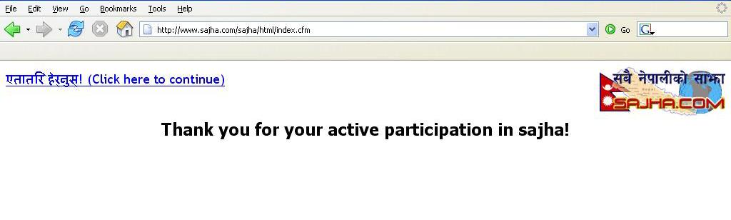 yea, i hate that feature 2.... u ask 4 aandolan , then aandolan u shall get !! :-) "sajha's annoying feature" .......... murdbaad !! "sajha's annoying feature" chorr ......... sajha chhod ! P.S.: (aru slogans ta audaaina, yaarr...... i guess, me- not experienced enuff.... my bad! Nepali polititicians lai bolaunu parcha, ani they'll bring aandolan anywhere,anytime... )
