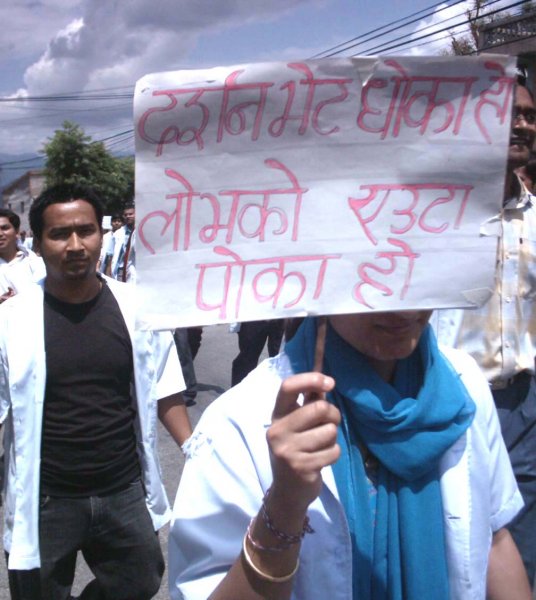 I really appreciate that placard denoucing darshan bhets.... I hope, in this way, current demonstaration will also denouce the useless corrupt netas of 7 parties and murderers of Maoists.