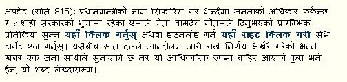 The latest address from KG adds nothing new---it's the same old farce of having a puppet prime minister--are the leaders going to be equally stupid and start fighting amongst themselves?..I hope not...if they do maybe this needs to become a two prong Andolan..on the one had keep the demands for Constituent assembly alive and on the other bring these "leaders" without brains and only hopes for the chair to task... nothing less than constitutent assembly should be agreed upon.