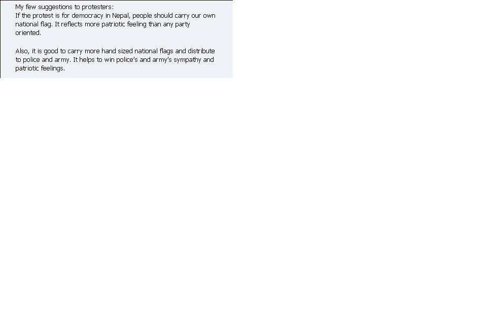 NOTE: The opinions here represent the opinions of the individual posters, and not of Sajha.com. It is not possible for sajha.com to monitor all the postings, since sajha.com merely seeks to provide a cyber location for discussing ideas and concerns related to Nepal and the Nepalis. Please send an email to [email protected] using a valid email address if you want any posting to be considered for deletion. Your request will be handled on a one to one basis. Sajha.com is a service please don't abuse it. - Thanks.