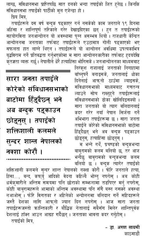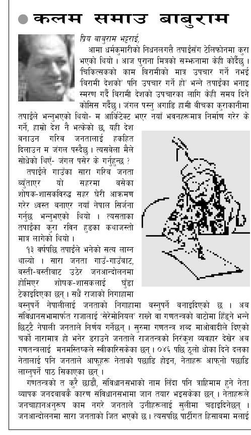 Here is Baburam's reply to the letter: Source : - http://www.kantipuronline.com/kolnepalinews.php?&nid=72612 नागरिक आन्दोलनकारीलाई पत्र डा. बाबुराम भट्टराई पि्रय डा. अरूण सायमी, वैशाख १४ गते कान्तिपुर दैनिकमा प्रकाशित तपाईंको चिठी 'कलम समाऊ बाबुराम' पढें । केही भावुक, केही चिन्तनशील बनायो । झन्डै तीन दशकअघि अखिल भारत नेपाली विद्यार्थी संघ -अभानेविसंघ) स्थापनाकाल स्मृतिपटलमा आयो । पार्टी प्रतिबन्धित भएको पञ्चायती कालरात्रिमा हामी निरंकुश राजतन्त्र अन्त्य र सच्चा लोकतन्त्र स्थापनाको सपना बोकेर भारतमा स्वतन्त्र ढंगले राजनीतिक गतिविधि गथ्र्यौं । नेपालमा कांगे्रस र कम्युनिस्टबीच पानी बाराबारका बेला हामी भारतमा सबैलाई एउटै मञ्चमा बोलाएर राजनीतिक अन्तरक्रिया गराउँथ्यौं । राजतन्त्र अन्त्य गर्न र गणतन्त्र स्थापना गर्न सबै राजनीतिक शक्ति एकताबद्ध हुनुपर्छ भन्ने हाम्रो आग्रह र प्रयत्न हुन्थ्यो । हाम्रो त्यो सपना हालैको ऐतिहासिक जनआन्दोलनका क्रममा पूरा हुन लागेको देखेर सन्तोष र गौरवको अनुभूति भएकै हो । यो आन्दोलनको सिलसिलामा हाम्रा ती पुराना सहकर्मीमध्ये तपाईंले सेतो कोट लगाएर शिक्षण अस्पतालका डाक्टरहरूको नेतृत्व गरेको, डा. महेश मास्के नागरिक आन्दोलनको अग्रपंक्तिमा उभिएको, हिसिला यमी युद्ध मैदानमा डटेको र अरू थुप्रै साथी विभिन्न पेसाकर्मी वा राष्ट्रसेवक कर्मचारीका रूपमा लोकतान्त्रिक आन्दोलनमा क्रियाशील भएको पाउँदा अभानेविसंघ कालीन हाम्रो प्रयत्न खेर गएको रहेनछ भन्ने सन्तोष मनमा लागेकै हो । परन्तु आजसम्मको आन्दोलनको परिणामबाट तपाईं जति सन्तुष्ट देखिनुहुन्छ, हामी त्यति ढुक्क हुनसकिरहेका छैनौं । किनकि तपाईंले पत्रमा भनेझैं राजतन्त्रले 'घुँडामात्र टेकेको छ,' समाप्त भएको छैन । तपाईं एकजना मेडिकल डाक्टरलाई राम्ररी थाहा छ, घुँडामात्र फुक्लँदैमा अस्तित्व नामेट भइसक्दैन, पुनः बौरिएर झन् बढी दुःख दिन सक्छ । २००७ सालपछि बारम्बार जनताद्वारा घुँडा टेकाइएको राजतन्त्रले पटकपटक बौरिएर जनतामाथि निरंकुश शासन थोपरेको हामी सबैलाई थाहा छ । नेपाली इतिहासका सबै जनआन्दोलनभन्दा अघि बढेर यसपटक राजतन्त्र फाल्ने सम्भावना प्रवल बनेको थियो । तर एक्कासि कश्मीरका पूर्वमहाराजामार्फत पठाइएको दिव्य गायत्रीमन्त्रले आर्यघाट पुगिसकेको राजतन्त्रलाई जीवनदान दियो । त्यसपछि अरू के कति गोप्य मन्त्र आए र अन्ततः संसद् पुनःस्थापनाको जाल फ्याँकेर आन्दोलनलाई मत्थर पार्ने काम भयो सबैको अगाडि छर्लंगै छ । आखिर राजतन्त्र नेपाली जनता र राष्ट्रिय एकताका निम्ति नभएर विदेशी शक्तिकेन्द्रहरूको स्वार्थ निम्ति पो रहेछ भन्ने प्रस्ट भएन त ? मेचीदेखि महाकालीसम्म लाखौं करोडौं जनताले संविधानसभा र गणतन्त्रको नारा लगाए, संसद् पुनःस्थ्ा
