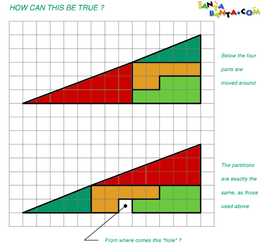 Here is my attempt to answer the triangle problem. In both the triangles, the hypotenuse are shorter (or equal to) the perpendicular, which is quite strange. So, my guess is the small squares are not proper squares; they just seem to be like squares. Here goes the pic again. (No wonder, It has been named 'headache'.