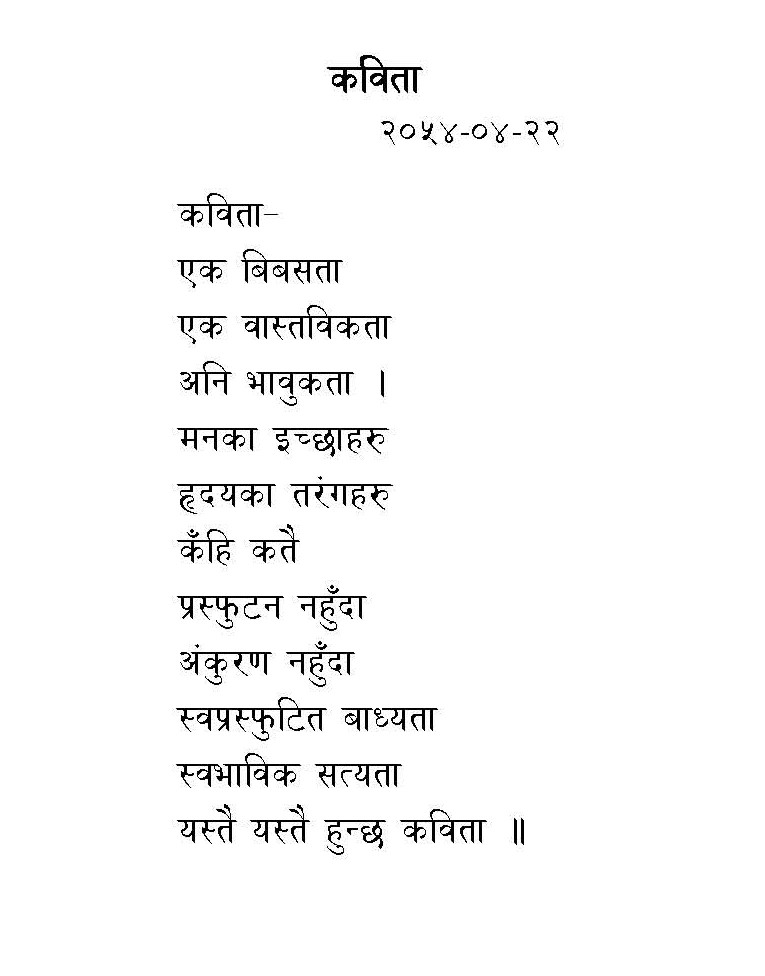 धन्यवाद दादा गुरु र सिरिष गुरु अनि सवैलाई; आज फेरी एउटा कविता टास्ने जमर्को गर्दैछु : प्रकृति-नियम अनन्त फैलियो यहाँ फुटेर शूक्ष्म सैकत पदार्थका कणा - कणा अनन्य शक्ति द्योतक पदार्थ - शक्ति, सृष्टिका अगण्य द्वैत संगम अनन्त्य कालको धुरी ! ब्रह्माण्ड घुम्छ फन्फन ॥ ॥१॥ अनन्त भौतिकी जगत् समस्त जीव, सृष्टिका नक्षत्र, सूर्य, चन्द्रमा खगोलका निहारिका नदी, समुन्द्र, हैमका चुली, पहाड, पर्वत पदार्थ - शक्ति कै बडो बिराट रूप सार्थक ॥ ॥२॥ बिभिन्न सूत्रमा उनी प्रकृति सृष्टि गर्दछिन् पदार्थ - शक्ति जोहदैं अनेक छद्म रच्दछिन् ! गरेर सृजना नयाँ, अपार सौम्य, कल्कल निमोठ्न उद्यत स्वयम् गरेर नाश पल्पल ॥ ॥३॥ हिजो जहाँ समुन्द्रका बिशाल छाल उर्लिए सफेद टाकुरा बनी हिमाल आज अग्लिए ! बिशाल डाइनोसरै ! गरेर नाद, गर्जना हिजो यहीं त घुम्दथे ! कठै विलुप्त आज ता ॥ ॥४॥ गुफा - गुफा चहार्नु नै हिजो त नित्य दैनिकी उही मनुष्य आज भोग्छ लौ अपूर्व जिन्दगी ॥ देखिन्छ आज जो यहाँ हिजो थिएन किञ्चित छ आज जो भविष्यमा रहन्न यो छ निश्चित !! ॥५॥ चलायमान कालको अमूर्त विन्दु - विन्दुमा बिनाश-सृष्टि बिम्बिका ! प्रकृति धर्म -तन्त्रमा - बिनाश मै छ सृष्टिको अथाह डिम्ब सेचन ! नियन्त्रणा ! प्रकृतिको अपार नाट्य मञ्चन !! ॥६॥