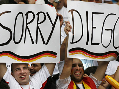 I have to say that when I was disappointed with Holland loosing the game and out of the World Cup, I accepted gracefully, eventhough I wholeheartedly disagreed with the refereeing and the fouling of the Portuguese. I just could not bear it, infact I was so disappointed that I thought I was never going to watch a single game in this World Cup. But fellas, this is only a game and that we should never take it so seriously. I still support Holland and I unbearably say that they will come out in the next European Championship firing. But the whining of the Argentine supporter is just too much to take. The game was dead locked with both sides playing well. I agree that Argentina controlled the ball well in the first half, but I thought there was never a grave threat in the germany's goal line. I thought yes they are playing well, but why the heck are they not shooting or not threatening when they are controlling the ball so well? I was infact surprised to see Germany not being able to attack, but the possesion that Argentina got and that they never looked threatening was shocking to say the least. They were playing with a plan to not let the Germans take control of the game. They succeded in doing that, but they fail to make a plan of attacking at the same time. It was negative plan to say the least and thats where they failed. The only chance was through a beautifully taken corner in which they headed home but from that onwards, I think Germany played way better. They controlled well, they never gave up and that is where I think Argentina should not have sat back and let Germans attack. They know how to control the ball as they did in the first half, why were they not able to do that after they scored the goal was surprising. But I believe the young German side, this coming from a neutral guy, played really well and they fought back and won. Please please please, why is it so hard to accept is I just cannot understand? Germany are hard to beat in penalty shoot out. They have lost very few when it comes to penalties, and so Argertina should have gone on an all out attack in the extra time. They did not. In fact both sides were tired, but Germany looked threatening when they went forward. They will take it pleasingly if it goes to penalties, because their record speaks volumes. But what has Argentina got to show when it comes to PSO. It failed miserably today for them. I think it is better not to make lame excuses and accept that Germany won it. The main score that counts is the score line and not this is what happened and this is what should have happened. Let us watch the game in true spirit of game man ship and accept that Argentina lost today. It wasn't bad refereeing, it wasn't because of Germany's physical play or diving. It was because of their negative play and a very good game that disappointingly ended in penalties. It was a coin toss. Both sides could have won in penalties. There is no justice here in penalities for both sides when they loose. My two cents. I am very sad that my Oranje Boys lost in a very saddened encounter with the goddam portuguese. We will get 'em next time.