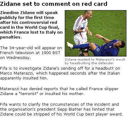 I think he will just apologize to the whole France and all his fan all aroud the world for letting them down,nothing more than that,I think he wont go blaming materazzi for the red card,he is a man of honour,he wont regret of what he did, I really hope so.