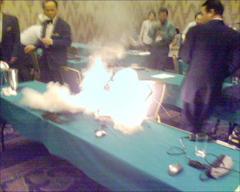 RHC, You should be glad this didn't happen to you...... Dell laptop explodes at Japanese conference Wednesday 21 June 2006, 13:22 AN INQUIRER READER attending a conference in Japan was sat just feet away from a laptop computer that suddenly exploded into flames, in what could have been a deadly accident. Gaston, our astonished reader reports: "The damn thing was on fire and produced several explosions for more than five minutes". Should you witness such an event, his advice is, "Don't try anything courageous/stupid, stay away, away, away!" "For the record, this is a Dell machine," notes Gaston. "It is only a matter of time until such an incident breaks out on a plane," he suggests. Our witness managed to catch all the action in these amazing pictures. "Fire extinguishers leave a mess on your suit and belongings; pack your stuff (if you can) and leave, leave, leave!" he advises. We don't have any further details of the model of the computer in question. In light of the evidence, however, we'd suggest you avoid actually using a laptop on your lap. Ouch.