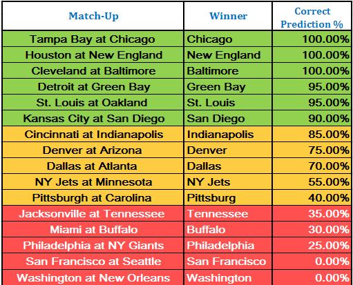 San Francisco at Seattle -----------> Seattle Dallas at Atlanta --------------------> Dallas Washingtonat New Orleans --------> New Orleans Tampa Bay at Chicago --------------> Chicago Pittsburgh at Carolina ---------------> Carolina NY Jets at Minnesota----------------> Minnesota Miami at Buffalo ----------------------> Miami Jacksonville at Tennessee ----------> Tennessee Houston at New England------------> New England Detroit at Green Bay-----------------> Green Bay Cleveland at Baltimore --------------> Baltimore Denver at Arizona -------------------> Denver Philadelphia at NY Giants -----------> Giants St. Louis at Oakland ----------------> St. Louis Kansas City at San Diego ----------> San Diego Cincinnati at Indianapolis-----------> Indianapolis