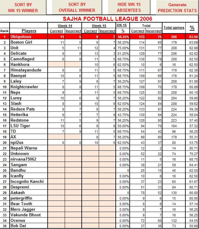 WEEK 15 RESULTS Here we go again SAJHA Football-ites...The results are out for Wk 15..... It was a pretty decent week for most of us, Except none of us thought 49ers could beat the Seahawks, OR Redkins could beat the Saints...Oh well, IT HAPPENED.