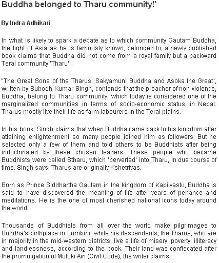 well i dont agree. it is a right for everybody to know where buddha belong to. We cant deny the history and we have to find out the truth. After all if buddha belong to tharu community we nepalese arnt losing anything rather it would be a matter of pride for tharu community. you people might even say why do we have to study and try to find out about dinosour who is no longer there. why do we need archelogist?