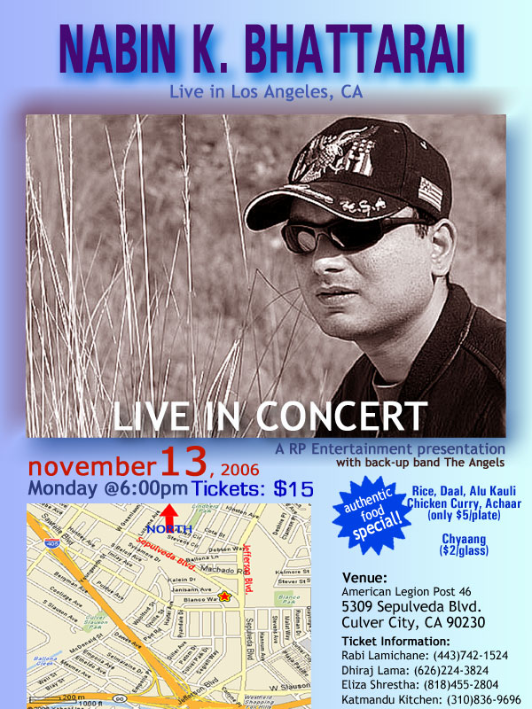 The Nabin K. Bhattarai Live Concert in Los Angeles has been changed to Monday 11/13/06 at 6:00pm. See attached picture for details