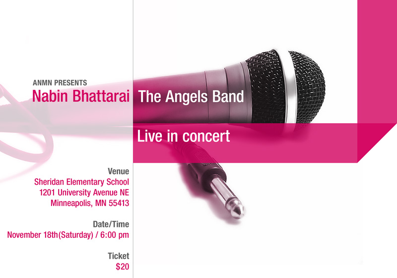 After Hugely successful shows in North Carolina, Florida, Atlanta, Alabama, Dallas, Denver and Nebraska, Nabin Bhattarai will be performing with The Angels Band in Minneapolis on November 18th (Saturday). It will be an exciting evening and Nabin Bhattarai is ready to bring the house down with his famous numbers... Please spread the word around. Let's support Nepali artists and show our appreciation to their hardwork and struggles. The goal of ANMN in organzing Nepali concerts is not solely for the purpose of entertaintainment. By inviting talented Nepali artist such as Nabin Bhattarai, we want to give Nepali community and friends of Nepal residing in MN, an opportunity to encourage Nepali artists to continue producing quality work of art. Let us open our hearts and give these artists who has been on the road for months now a rousing Minnesota welcome. Ticket info: If purchased before November 16. 1) A bulk of 4 tickets for $70 ($17.50 each) 2) Student rate at $18 per ticket (valid student ID required) 3) $20 for each ticket. After Nov 16 $20 for each ticket. Venue: Sheridan Elementary School 1201 University Avenue NE Minneapolis, MN 55413 Time: 6:00 pm Contacts for purchasing tickets: In Twin Cities area: Deepak Thapa: (952)212-7810 Sugam Shrestha:(651)226-8890 Anwesh Rijal e-mail: [email protected] Everest On Grand 1278 Grand Ave., St. Paul Phone: (651)696-1666 Other outlets: In Mankato: Bhuvanesh Bista: [email protected] In Marshall: Ajit Yadav: (612) 360 1381 In Moorhead: Bhaswat Rijal:(701)261-7518. e-mail: [email protected] In St.Cloud Ummid Lohani: (651)231-1551. e-mail: [email protected] Tickets paid in advance can be picked up at the will-call desk. Please visit www.anmn.org for more information. with warm regards, ANMN executive board