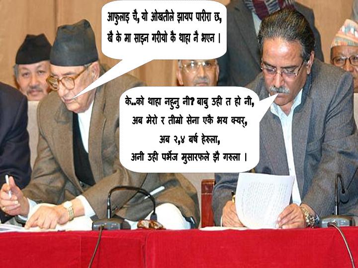 Timroba, Ramro chha. Euta Deuda pani .................. Grija ra Puspe (Prachanda) mili, sign gare samjhauta (peace accord) Raja (Gyane) Ko ku-buddi nafiryo vanya, sabaiko hunthiyo byawastha (welfare)