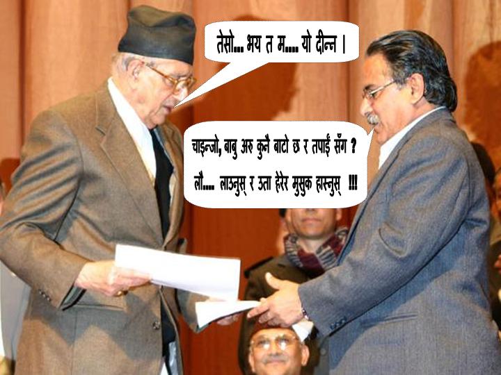 Great News....I hope Maobadi will not change their mind and the other Fraction of Maobadi so called Terai Janata morcha (or what ever their name is) will not copy Maobadi's style. If they did hopefully Puspa Kamal Dahal and his party will take care of them and I hope MaKuNe will not be pissed coz he could not be a Prime minister at the age of 74. Its all I have to say