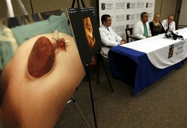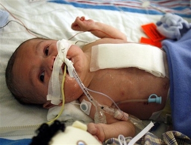 A BABY BORN HEART BEATING OUTSIDE IN THE HOLTZ CHILDREN'S HOSPITAL UNIVERSITY OF MIANI JOCKSON MEMORIAL MEDICAL CENTER,BABY NAME NASEEM HASNIS HEART IS SHOWN OUTSIDE OF HIS BODY.THE RARE CONDITION CALLED ECTOPIA CORDIS THAT OCCURS IN ABOUT 5.5 TO 7.9 PER ONE MILLION LIVE BIRTH.