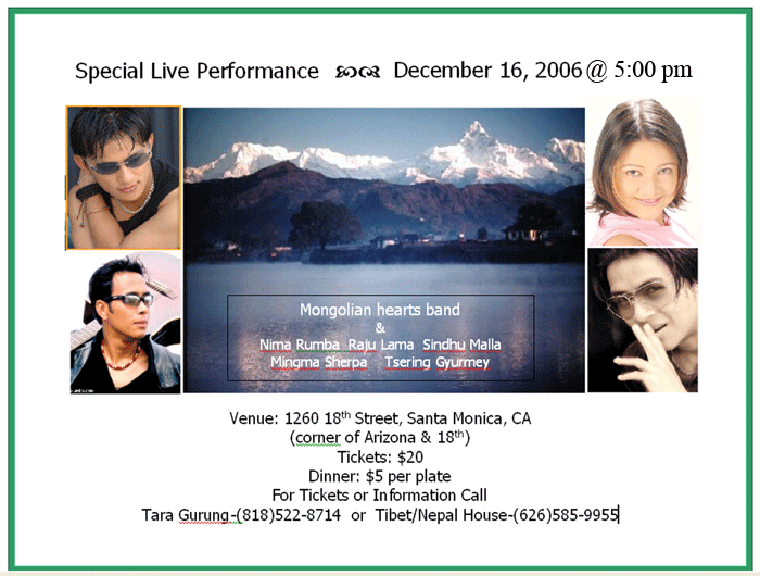 Mongolian Hearts Band & Nima Rumba, Raju Lama, Sindhu Malla, Mingma Sherpa and Teshering Gyurmey Live In Concert –Los Angeles 16th December 2006 @ 5:00pm Venue: 1260 18th Street Santa Monica, CA 90404 (Corner of 18th and Arizona) Tickets: $20 Dinner: $5/plate For Tickets/Information: Tara Gurung: 818-522-8714 Tibet/Nepal House: 626-585-9955