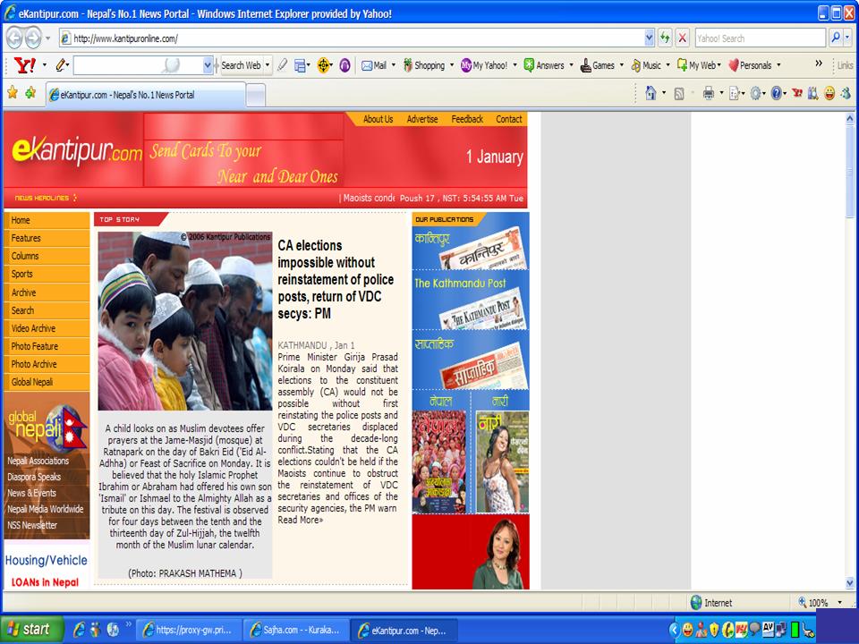Guys, Just go to www.ekantipur.com It's the same website- different domain name! According to "whois," kantipuronline was updated on jan 01, 2007. That might be the reason for the problem. Here are a few details about kantipuronline.com Registrant: Kantipur Publications Pvt. Ltd Kantipur Complex Tinkune Kathmandu, BA 8559 NP 977-1-480100 Fax:977-1-4470178 Domain Name: KANTIPURONLINE.COM Administrative Contact: Oli, Yubaraj [email protected] Subiddhanagar Kathmandu, BA 8559 NP 977-1-4480100 Fax:977-1-4470178 Technical Contact: Oli, Yubaraj [email protected] Subiddhanagar Kathmandu, BA 8559 NP 977-1-4480100 Fax:977-1-4470178 Record last updated 01-01-2007 08:04:12 AM Record expires on 02-20-2009 Record created on 02-20-2000 Domain servers in listed order: NS0.DIRECTNIC.COM 204.251.10.100 NS1.DIRECTNIC.COM 206.251.177.2