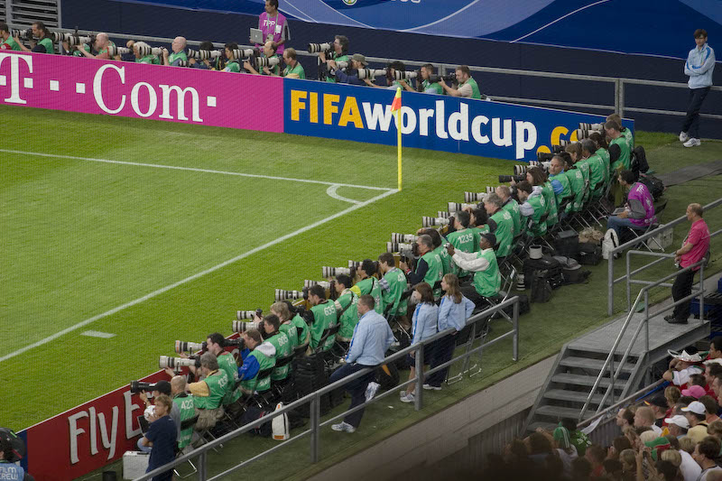 Most of them are using Canon because of the simple fact.. inside the staduim there will be a constant and stable lighting situation and the lighting variation is mininal (almost like a studio) .... therefore neither the camera nor the photographer has to do much of adjustments interms of camera settings. Try this anywhere where there are no overhead lights (like staduim or studio) providing constant lighting...