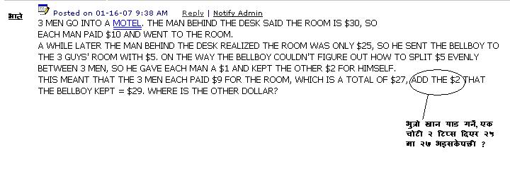 ए भाते बाबु तिमिले २७ डलरमा किन बेल बोइले लेको २ डलर फेरी जोड्न खोजेर २९ डलर बनाउन खोजेको? त्यो २७ त २५ होटलमा तिरेपछि बेल बोइले लेको २ डलर समेत गरेर २७ भइसक्यो। यसरी २७ ( प्रतेकको नौ खारेज भयो ) । बाकी १, १ त ति ३ जना ठिटाले पाइसके, तेसरी ३० को हिसाब मिल्यो । ल भन हिसाब कता बुझेनौ ?