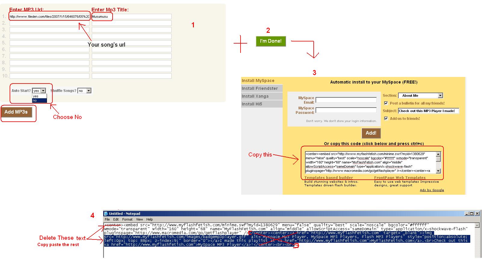 nirvana2382 I will correct the problem soon, and will get back to you later hai. swatantratagaamy go here and create a free account here: http://www.fileden.com/ upload your songs and copy your song's link at http://www.myflashfetish.com/makemp3.php?id=10 and to post, I have made a small guide, Hope it is helpful.